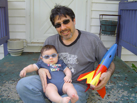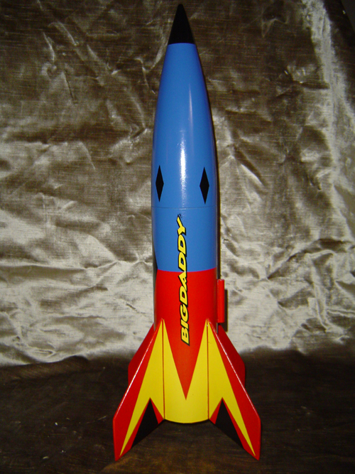 A wonderful thing happened on the way to finishing this classic from Estes. I became a daddy. That's right MAX arrived somewhere between the grain sealer coats and the primer. Powered by a 24mm engine, the Big Daddy has been issued and reissued by Estes in different forms throughout the years. For us it marked our first application of decals utilizing the Microscale family of products. Microscale liquids ease the application, positioning, adherance and endurance of water slide decals.. Now that we've tried em', we're set. The decals look like they were painted on. Big Daddy's 3" diameter air frame requires at least 22 Newtons of thrust to leave the pad and he can reach 900 feet on an E engine. A colorful 24" parachute brings Big Daddy home safely.