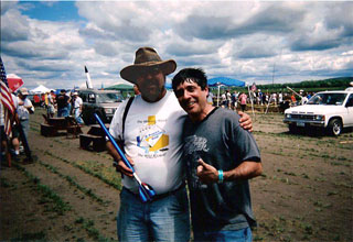 The smiling man on the left (shaded by the hat) holding the Long